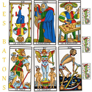 Dans le Tarot de Marseille, les bâtons symbolisent le Feu, l’énergie, et sont associés aux chakras supérieurs. Ils correspondent aux corps énergétiques Causal, Bouddhique, et Atmique. Les bâtons jouent un rôle de soutien dans les arcanes majeurs, chaque bâton apportant une énergie spécifique en fonction du personnage qui le porte.