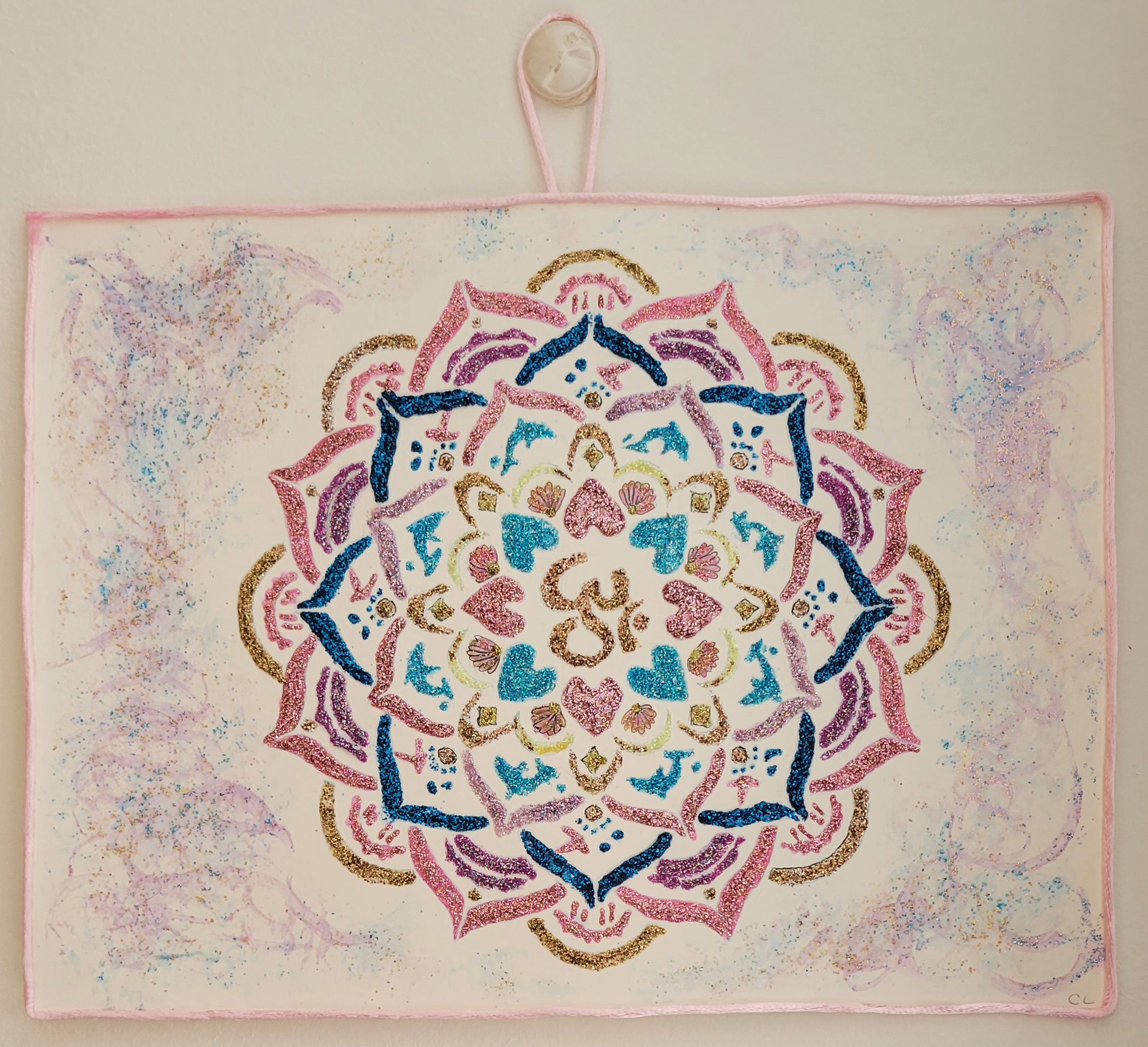 Chaque mandala est unique, dessiné à la main et peint avec de la poudre de paillettes, pour une œuvre vibrante et lumineuse.
